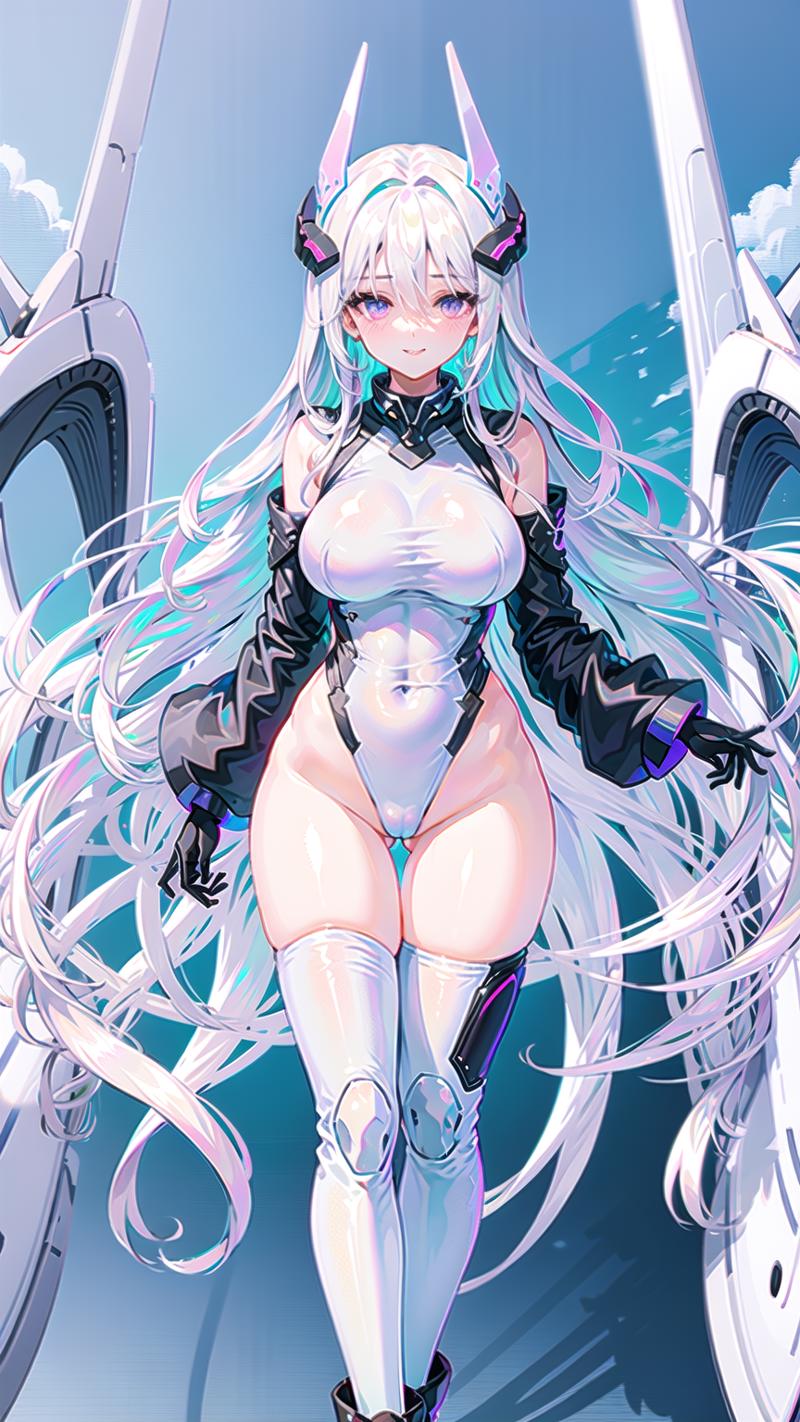 1girl, solo, thighhighs, leotard, purple eyes, gloves, large breasts, white hair, long hair, highleg, covered navel, single thighhigh, white thighhighs, headgear, thighs, hair between eyes, highleg leotard, bangs, white leotard, long sleeves, smile, closed mouth, multicolored hair, groin, boots, thigh gap, <lora:KearsargeV1-000008:0.6>, usskearsarge, blue sky, blue sky, clouds, sky background,