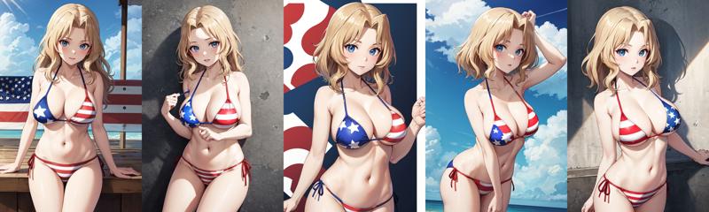 cckay,long hair,cleavage,swimsuit,side-tie bikini bottom,flag print,american flag bikini,