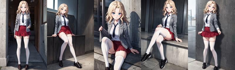 aakay,long hair,saunders school uniform,blazer,grey jacket,long sleeves,open jacket,wing collar,white shirt,necktie,red skirt,white thighhighs,shoes