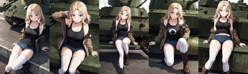 bbkay,long hair,saunders military uniform,brown jacket,open jacket,long sleeves,emblem,black shirt,(tank top:1.2),denim shorts,(white thighhighs:1.2),boots